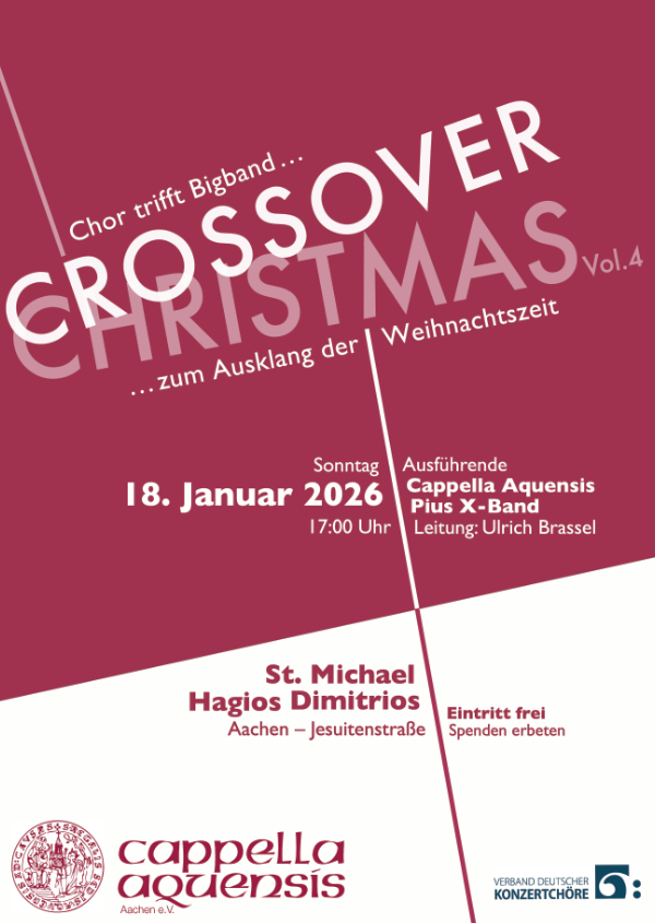 Zu hören sein wird all dies in dem Konzert unter dem Motto „Crossover Christmas – Chor trifft Bigband Vol.4“ am Sonntag, dem 18. Januar, um 17:00 Uhr in der Kirche Hagios Dimitrios in der Jesuitenstraße. Der Eintritt ist frei, Spenden erbeten.